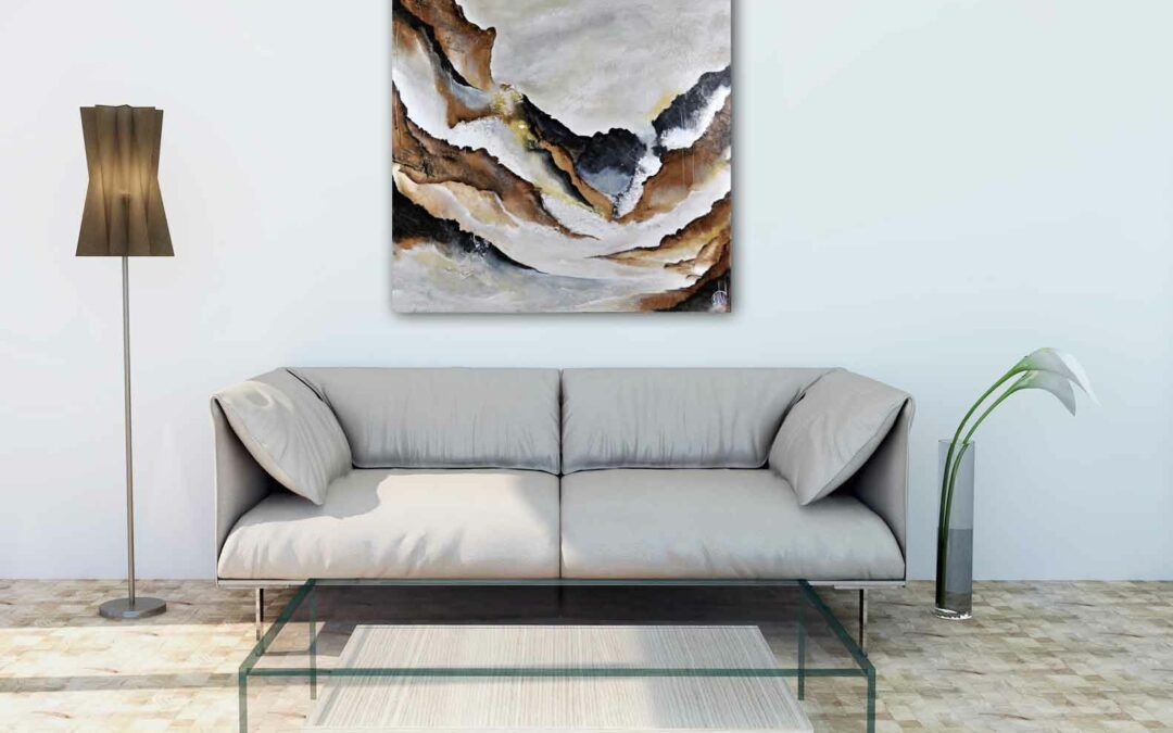Peinture abstraite moderne aux teintes ocres, brunes et grises.