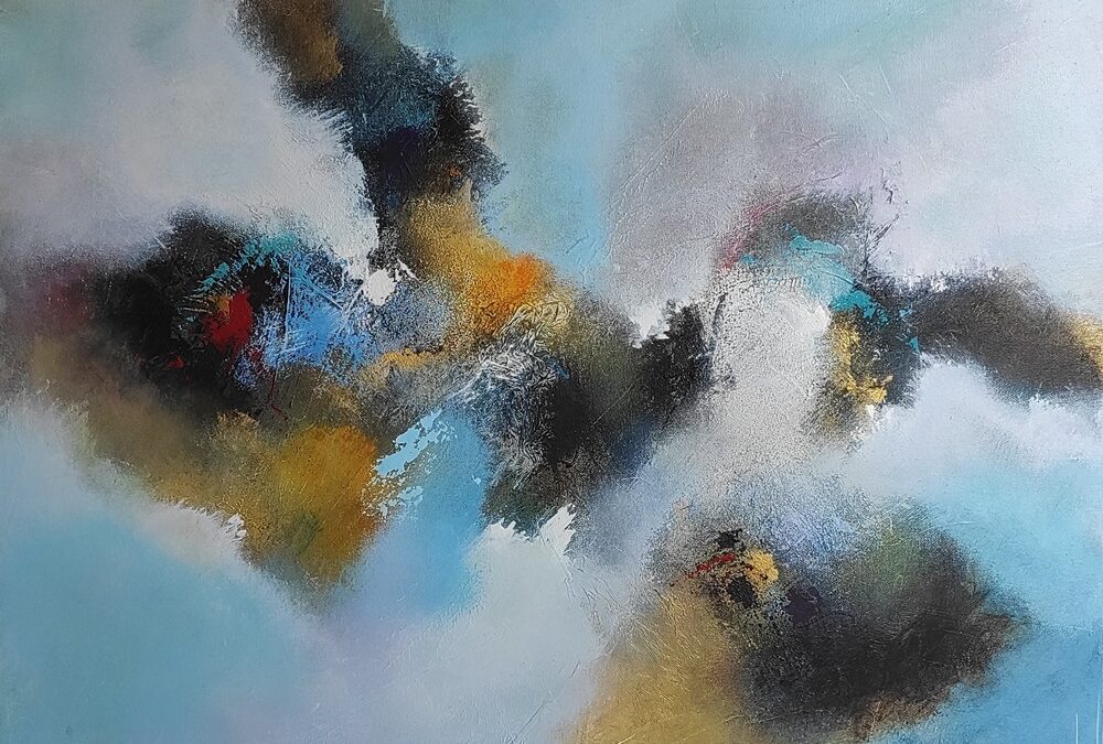 Plongez dans un "Voyage dans l'abstraction" avec ce tableau saisissant aux dimensions de 60x73 cm. Les couleurs qui dominent l'œuvre sont un bleu captivant, unique en son genre, accompagné de subtils accents d'ocre jaune, d'orange et de rouge. Ces teintes harmonieuses se fondent en dégradés et en mouvements, créant une atmosphère envoûtante. Les textures délicates, le sable et le papier de soie, ajoutent une dimension tactile qui invite à une exploration sensorielle. Ce tableau évoque à la fois la majesté des nuages et la vue céleste, vous transportant vers des horizons inconnus et mystérieux. L'abstraction vous emmène dans un voyage introspectif, où chacun peut interpréter les formes et les couleurs à sa manière, laissant libre cours à l'imagination. Accrochez cette œuvre fascinante dans votre espace pour vous laisser porter par les nuances infinies de l'abstraction et vous rappeler que chaque voyage commence par un simple regard vers l'inconnu.